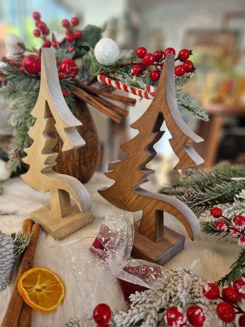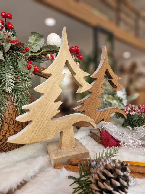 Decorazione natalizia realizzata in legno massello di frassino dal design leggero e adatto ad ogni tipo di arredo. Questo abete natalizio é realizzato artigianalmente e disponibile in tre colorazioni base arricchite da sfumature bianche o oro  a simulare una leggera neve sullo spessore.