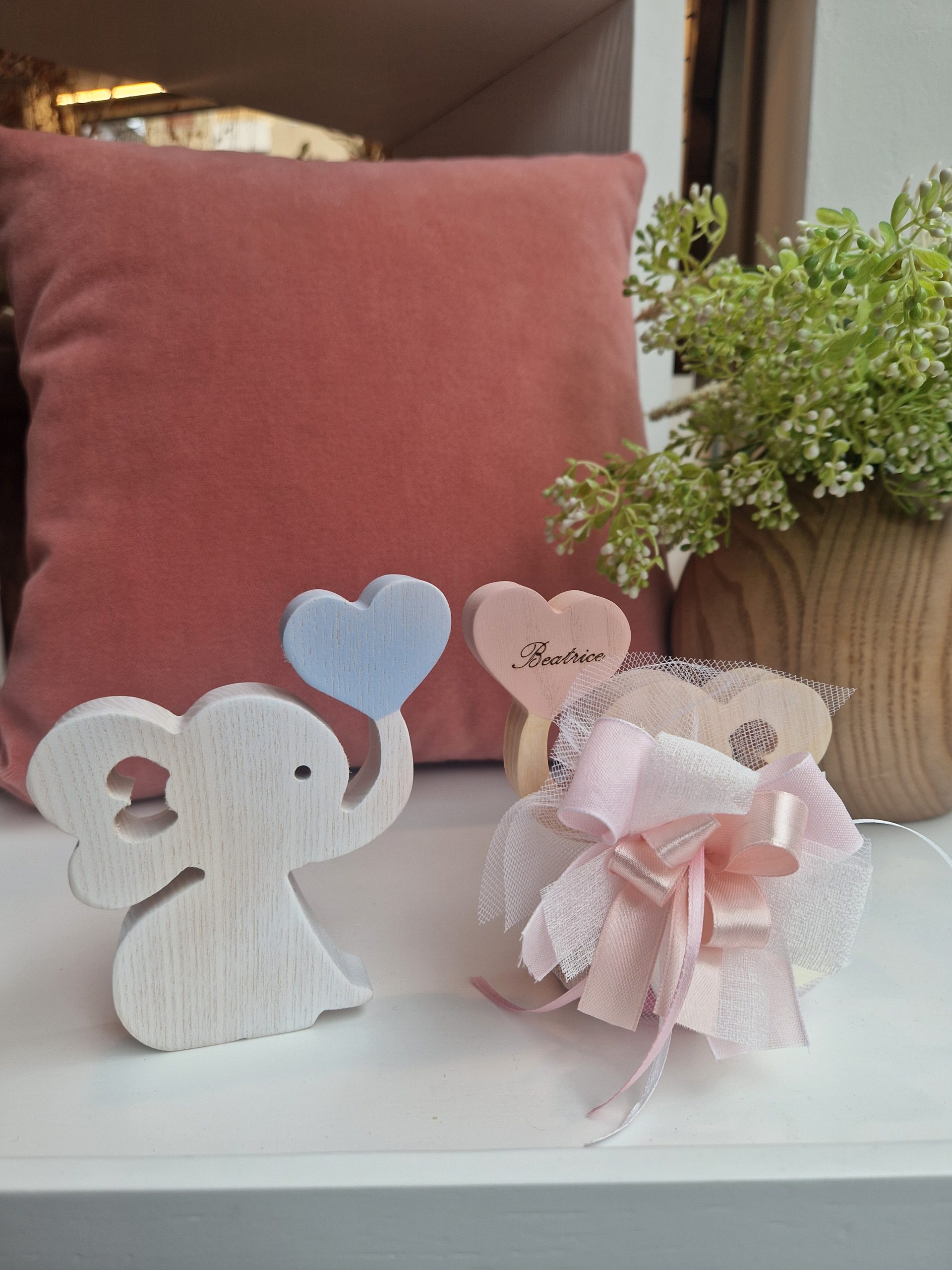 Colore bianco con venatura del legno visibile per l’elefantino e cuoricino in contrasto di colore rosa, azzurro, tortora o rosso.