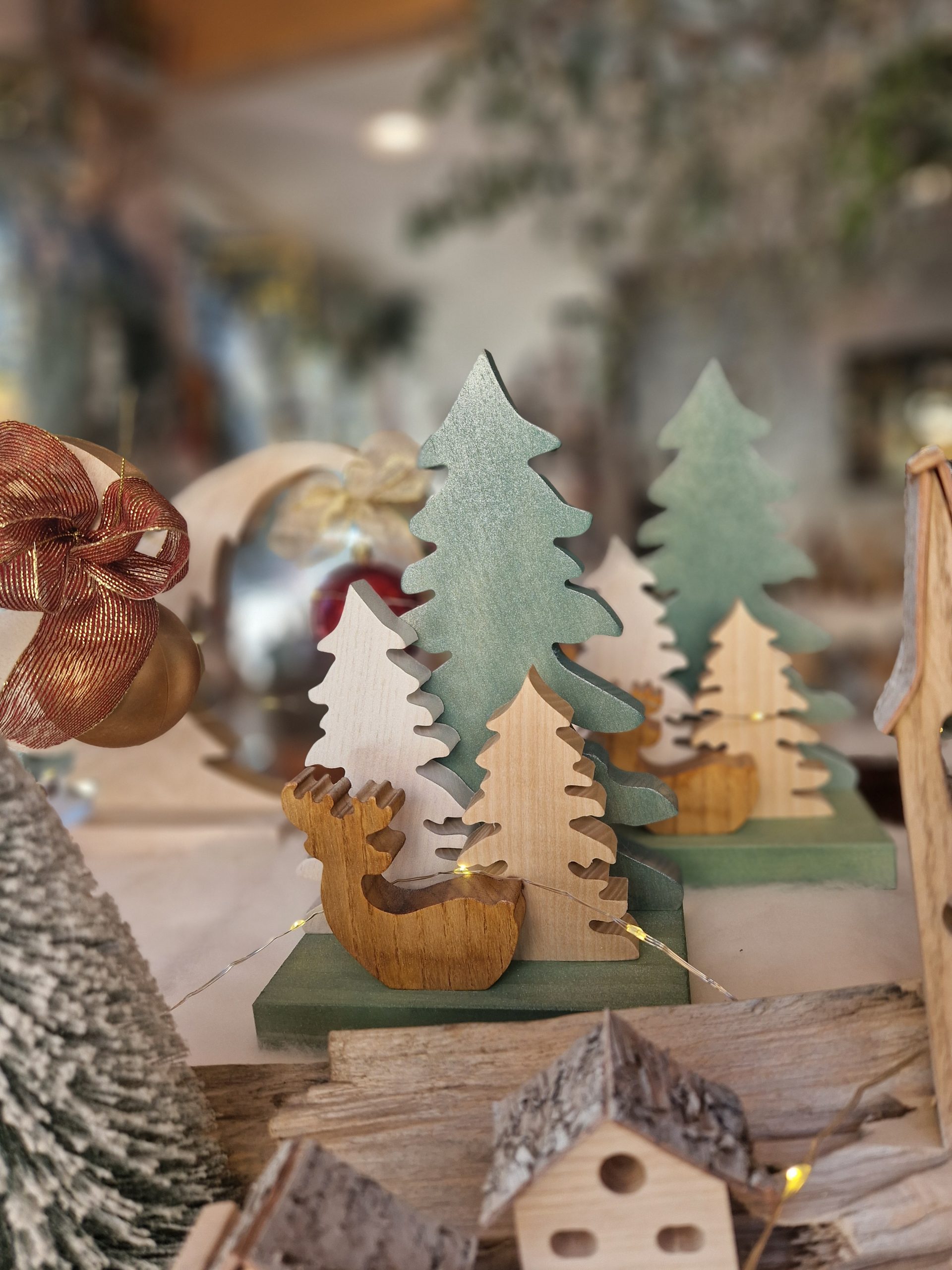 Decorazione invernale realizzata in legno di frassino composta dall’ insieme di tre alberi in contrasto di colore tra loro con alla base un cervo accovacciato. Il tutto è impreziosito da una piccola decorazione di cannella , lana e pigna.