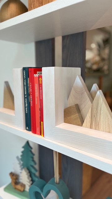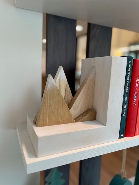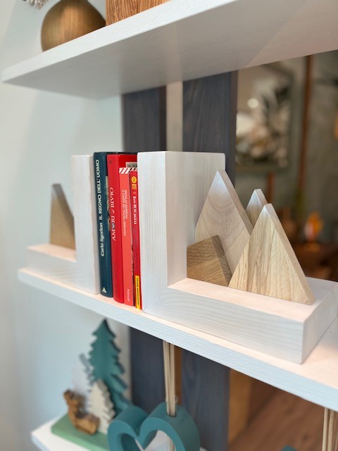 Set di due fermalibri in legno massello di varie essenze rappresentanti le montagne lavorato a mano