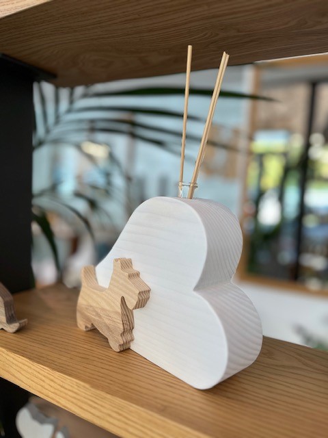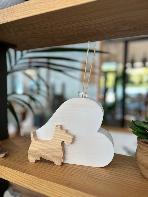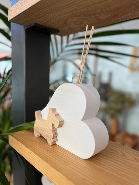Profumatore per ambienti con bastoncini a forma di cuore con cane sormontato, realizzato in abete e frassino è comprensivo di fiala in vetro per  contenere essenze profumate o un fiore e bastoncini in bambù. Il cuore è realizzato in abete con finitura di colore bianco e venature del legno visibili il cane è in frassino naturale o nero in contrasto di colore.
